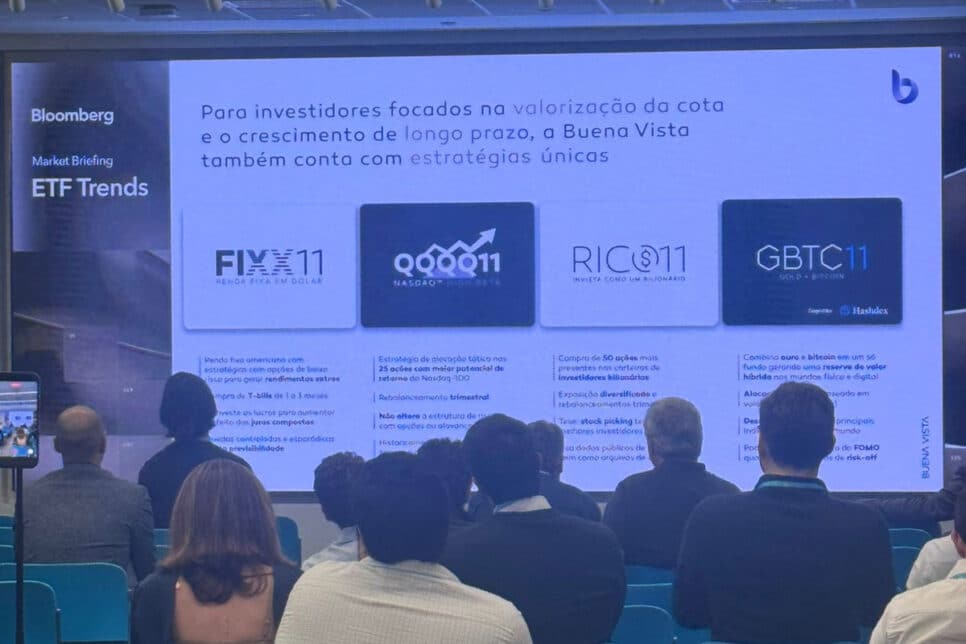 Dentre os produtos destacados, estão o FIXX11, QQQQ11, RICO11 e GBTC11. O CEO e CIO da Buena Vista, Renato Nobile, enfatizou que a proposta da gestora transcende a simples exposição ampla aos mercados financeiros.