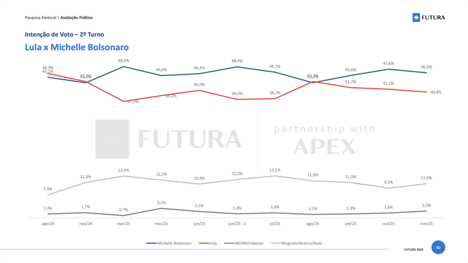 Um novo levantamento eleitoral, divulgado em novembro de 2025 pela Futura Inteligência, revela dois movimentos principais na corrida para 2026. O estudo indica que Lula (PT) mantém a liderança em diversos cenários testados, enquanto Michelle Bolsonaro se destaca como a única integrante da família Bolsonaro com real competitividade.