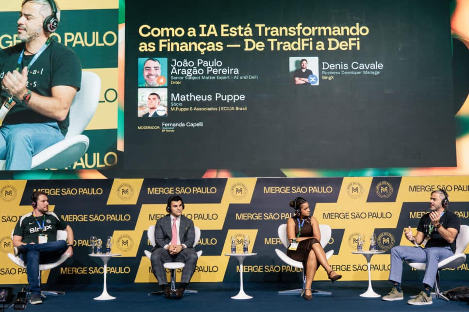 Um dos eventos mais relevantes sobre o tema em 2026 foi o MERGE São Paulo, que reuniu especialistas para discutir o impacto da IA nas finanças. Em um painel intitulado ‘Como a IA Está Transformando as Finanças — De TradFi a DeFi’, foi destacado que a lógica de operação do mercado foi alterada, com a diminuição da necessidade de intermediários para verificar contratos.